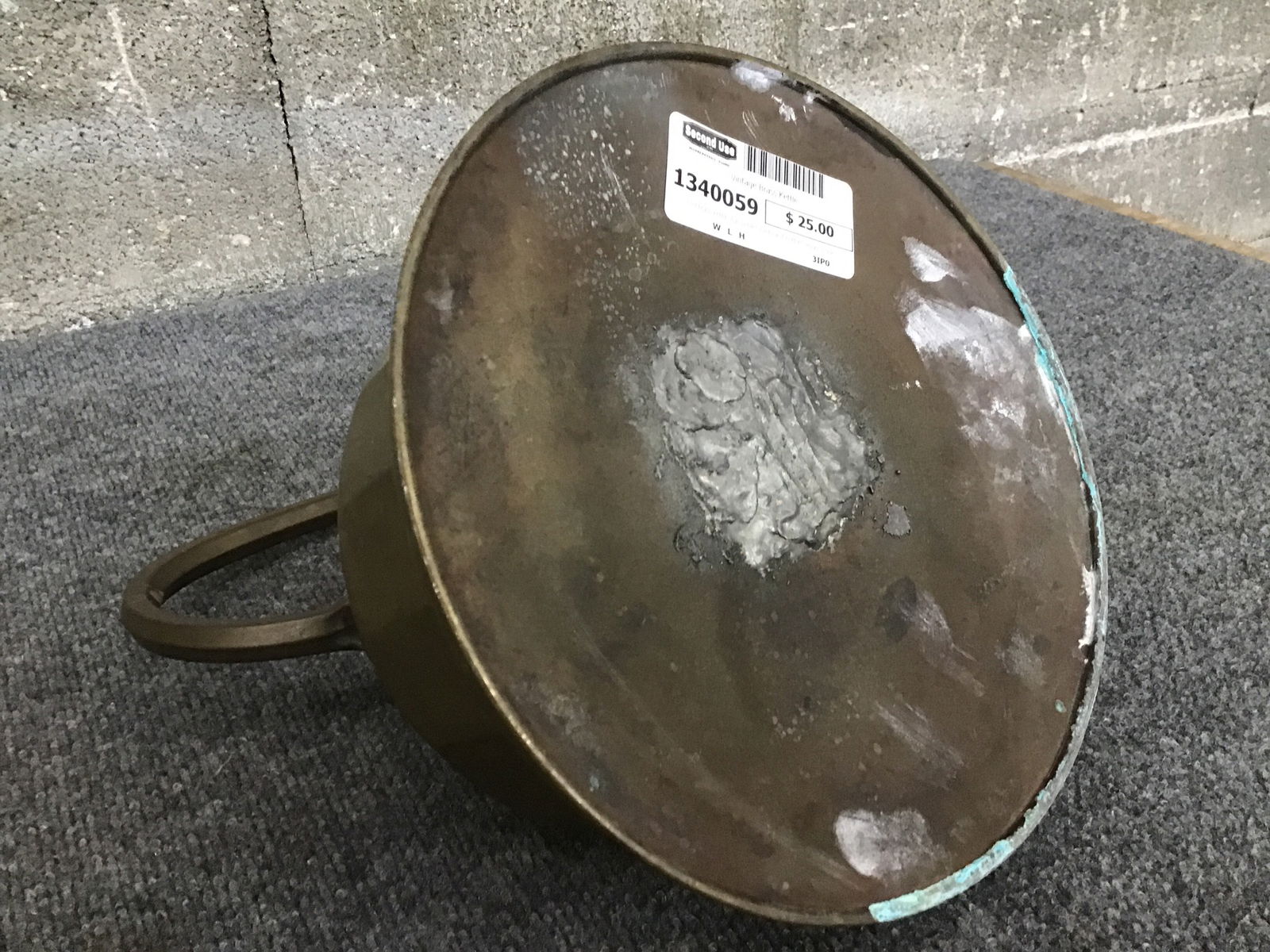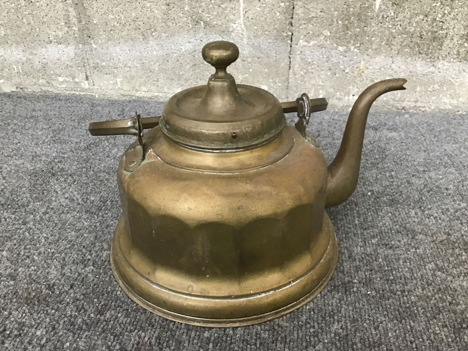 Old brass kettle, has solder joints and bottom repair. Looks great, might want to consider before heating your tea water in here.
