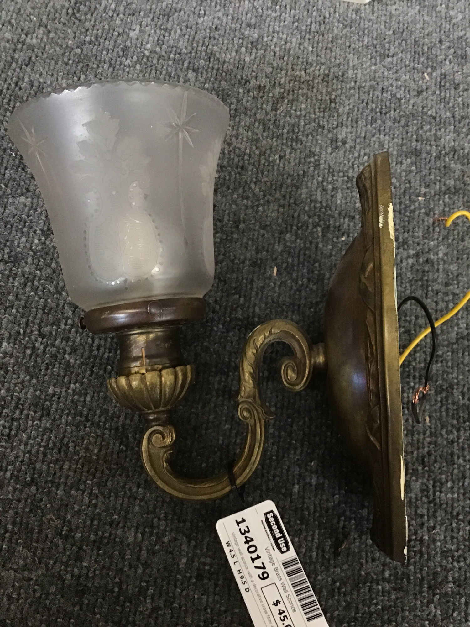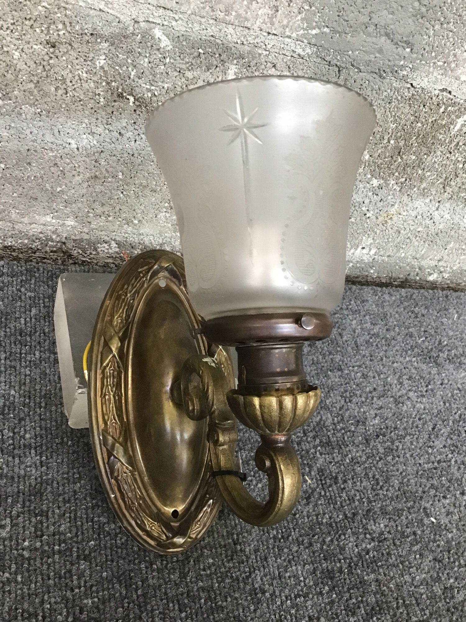 Vintage wall sconce with a decorative brass fitter and shade is packed with tons of little etched and cut details. She's a pretty one!