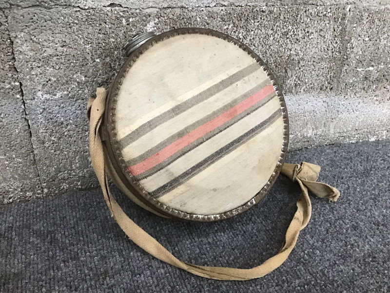 Vintage galvanized steel canteen with striped canvas faces and cotton strap. Other than the cloth being faded, appears to be in good condition.