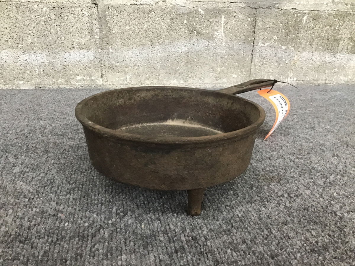 8 inch vintage cast iron pan with feet. Inside is clean, bottom has some pockmarks.