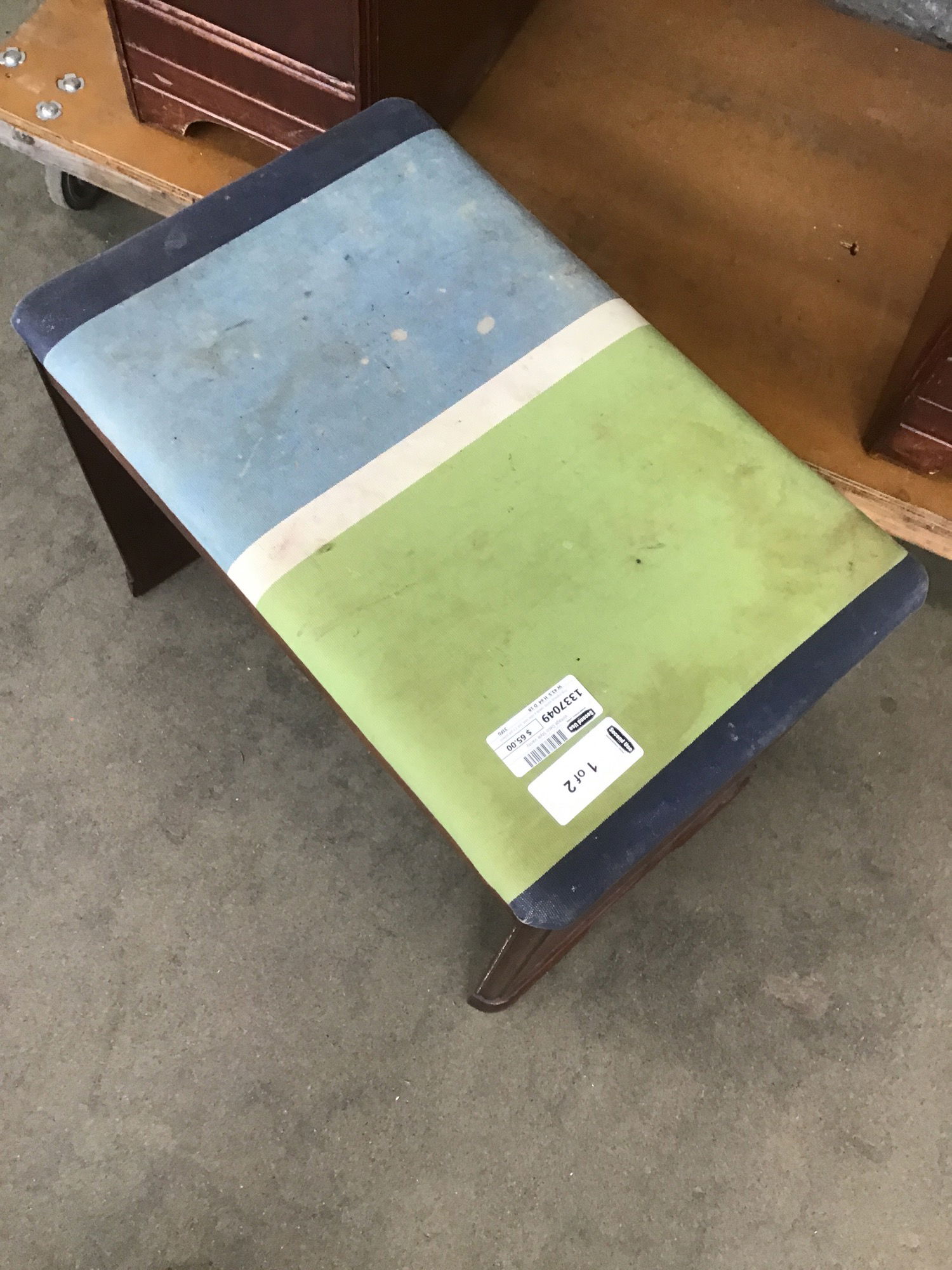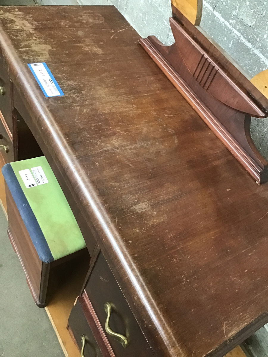 This makeup vanity needs a little love, but it's got potential to be very cute!! The top could use a refinish, the mirror needs to be replaced (or ditched) and the little bench seat could probably stand to be reupholstered.