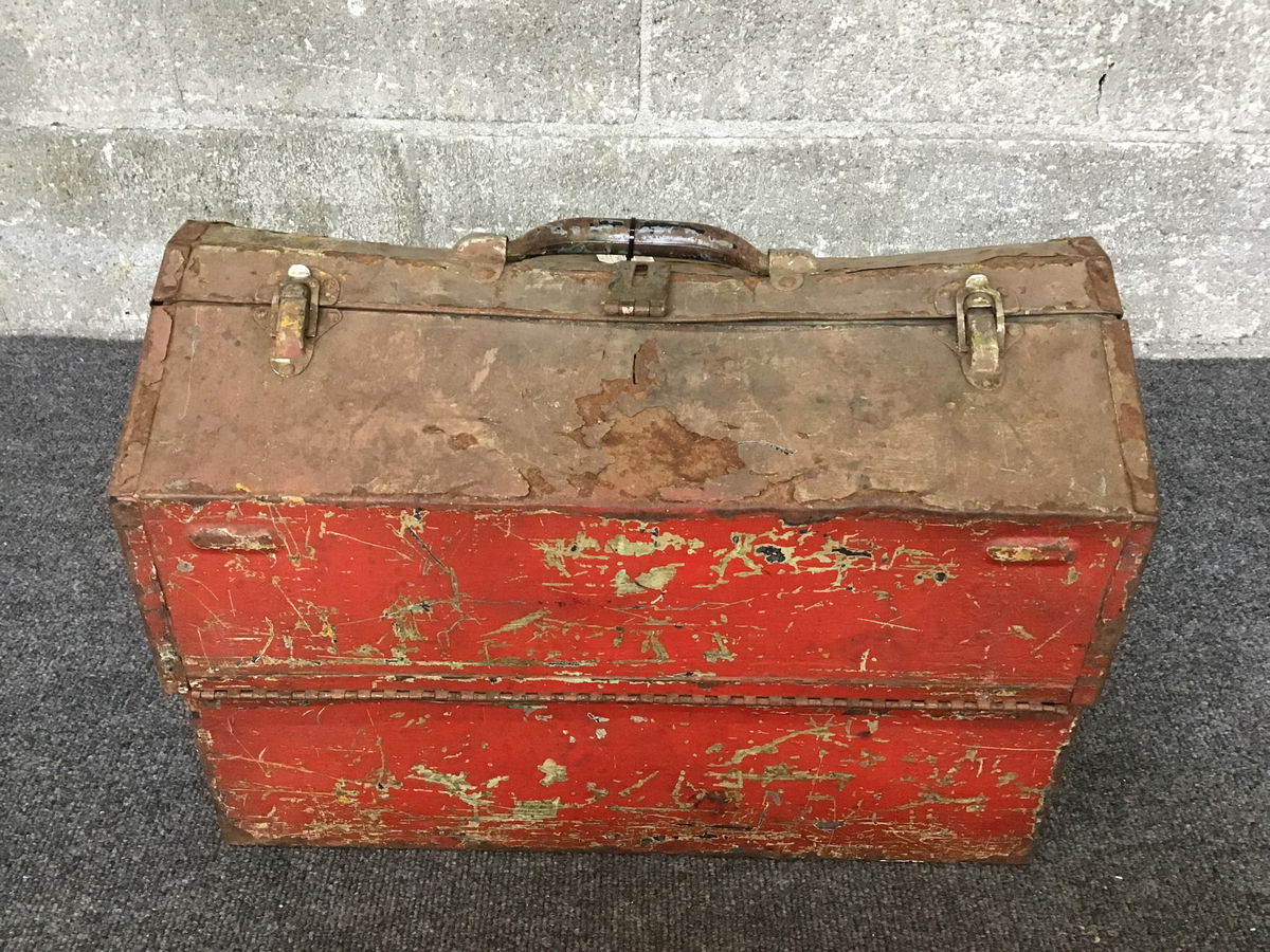 This toolbox has seen decades of use but once you open it up, you understand why. When opened, the toolbox reveals two opposing multitiered trays and deeper storage underneath. Super cool design that still feels practical.