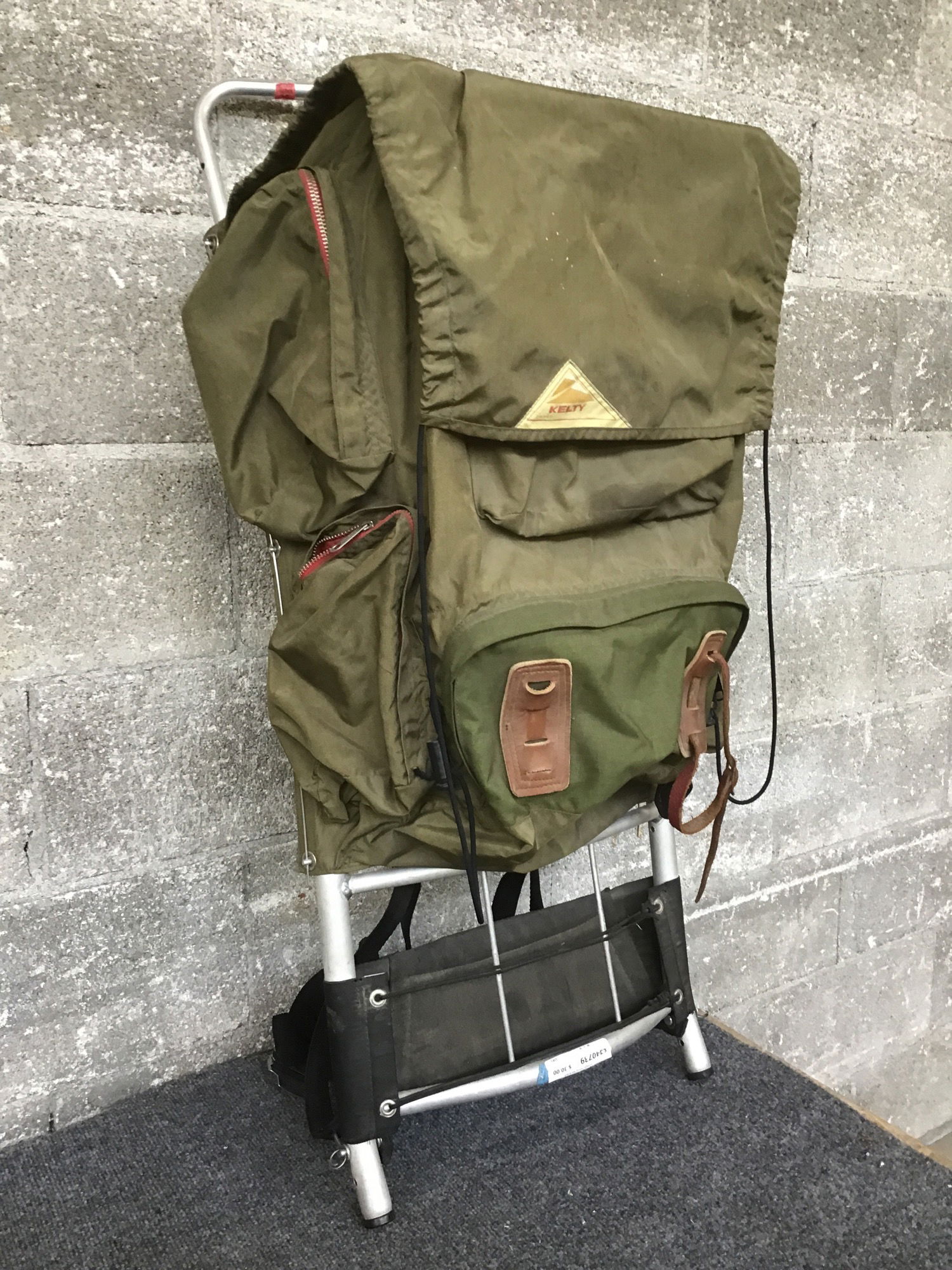This is a vintage aluminum framed hiking backpack with a classic olive green bag that has leather straps to secure your pack.