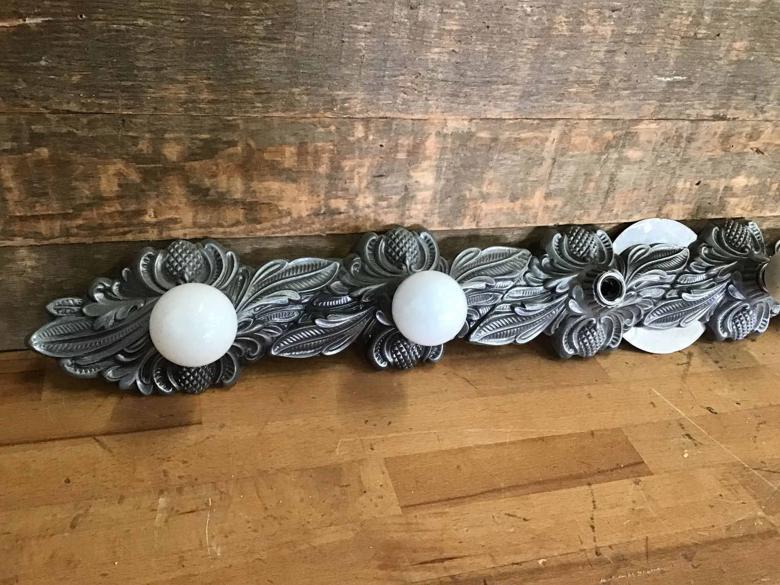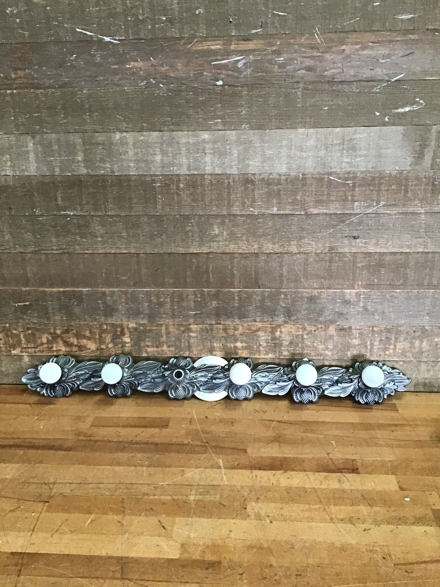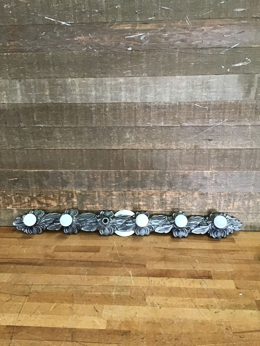 Vintage 6-bulb hollywood regency style vanity light bar. Mounting plate is metallic but light itself is crafted of molded plastic. Very cool piece. Wiring is in good condition.
