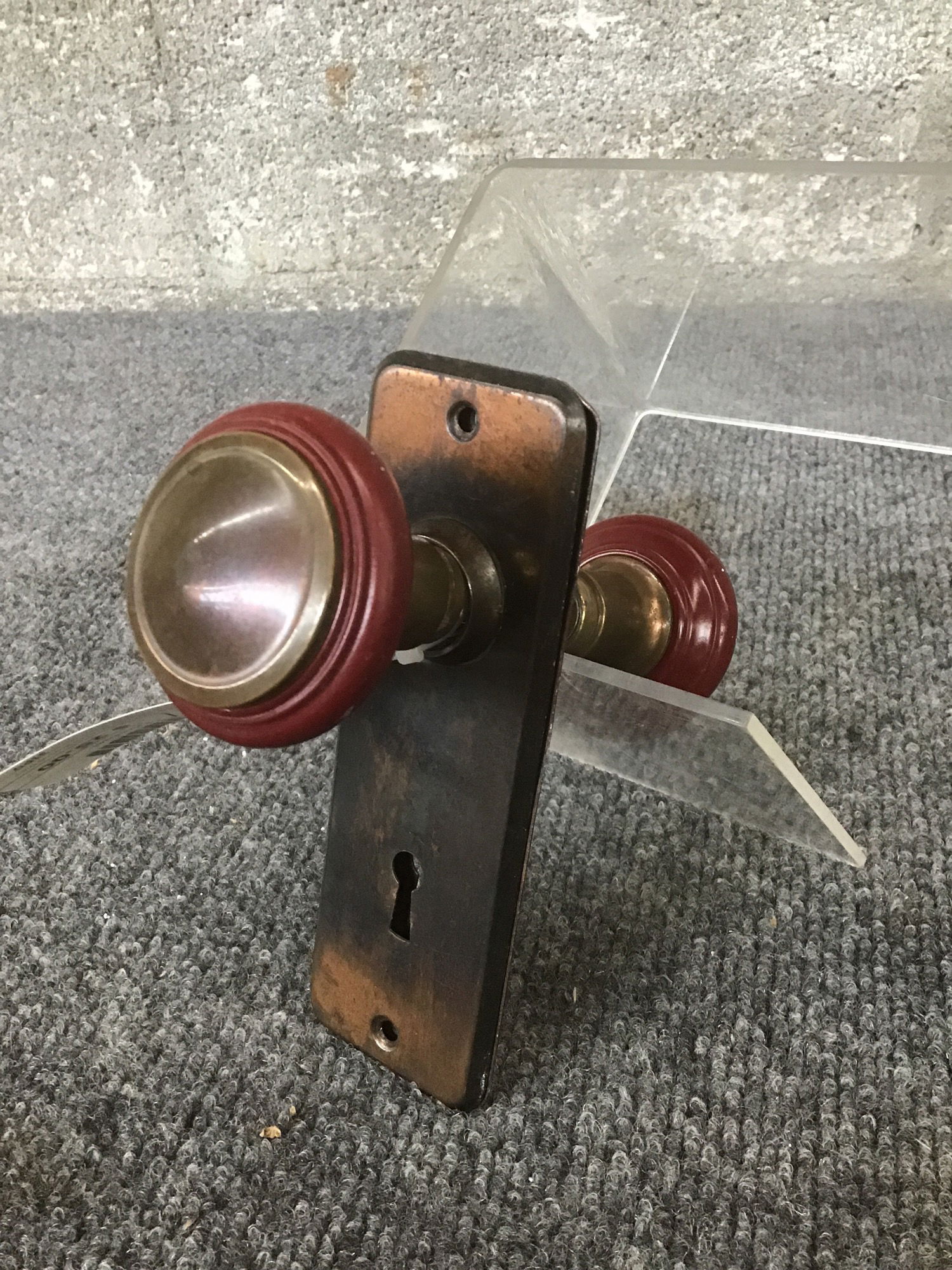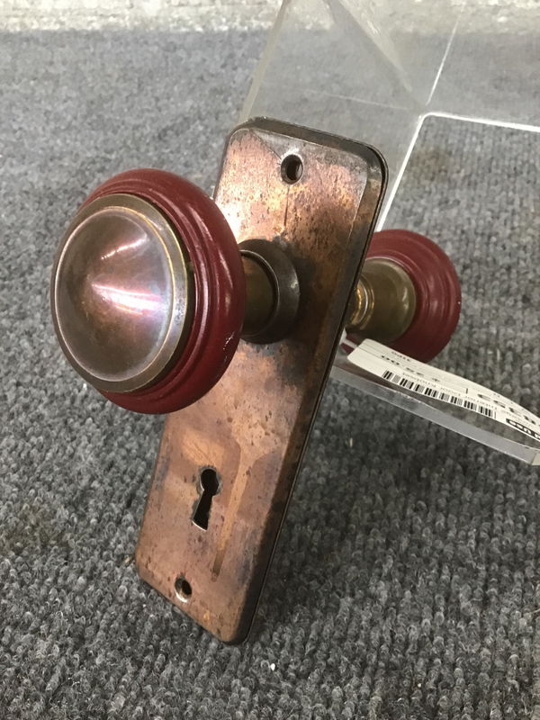 Pair of vintage interior knobs with red accents around their edges. These red accents seem to be Bakelite! Door plates are lovely Japanned copper, making the whole ensemble elegant and pretty.