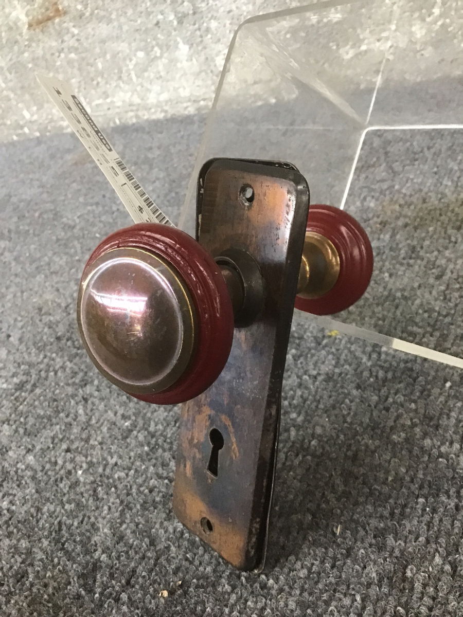 Pair of vintage interior knobs with red accents around their edges. These red accents seem to be Bakelite! Door plates are lovely Japanned copper, making the whole ensemble elegant and pretty.