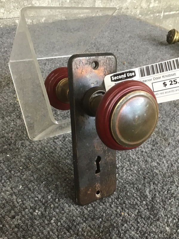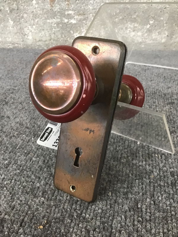 Pair of vintage interior knobs with red accents around their edges. These red accents seem to be Bakelite! Door plates are lovely Japanned copper, making the whole ensemble elegant and pretty.