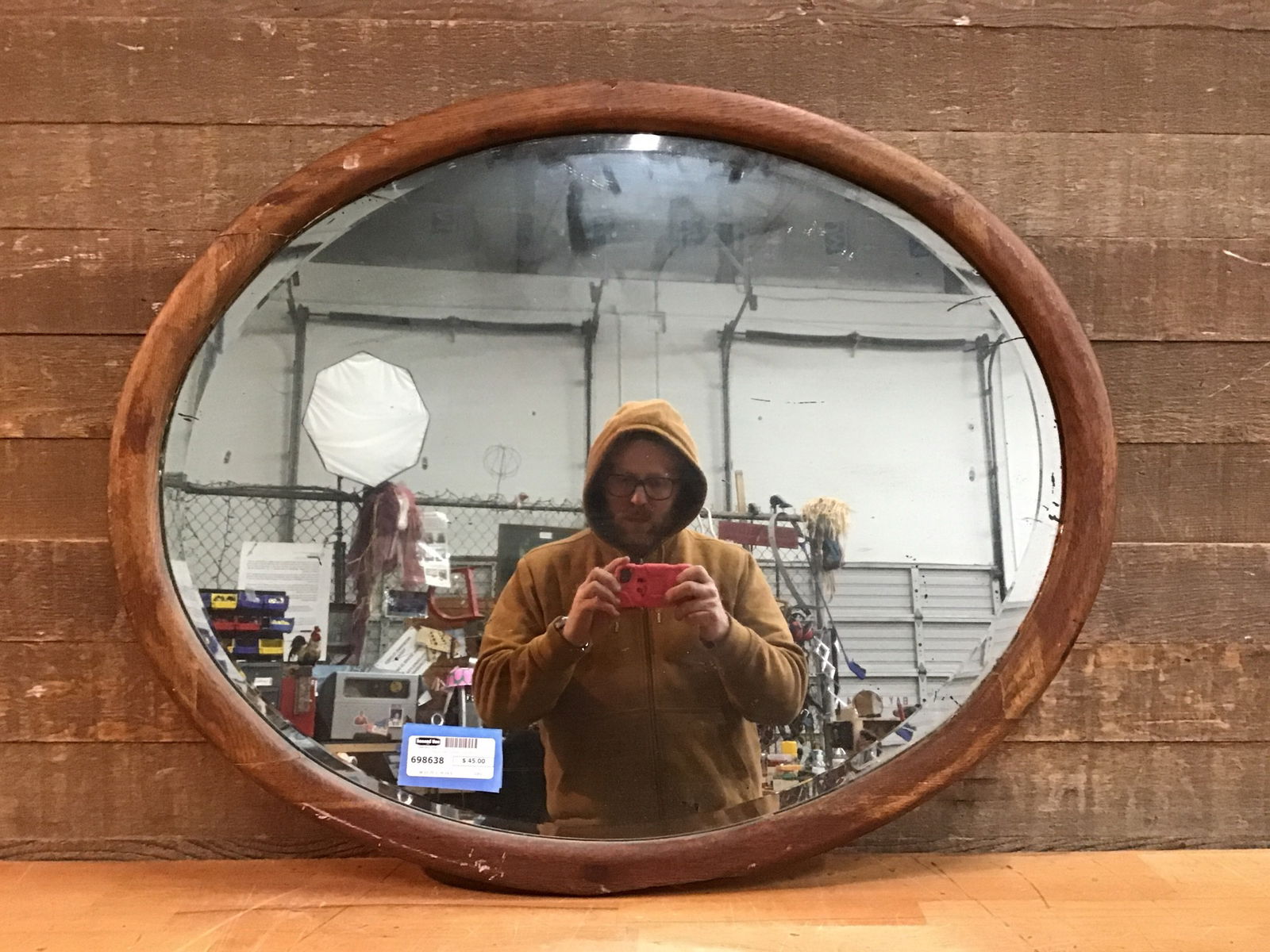 Check out this oak framed oval mirror! Has signs of use and maybe a little paint, could be cleaned up easily.