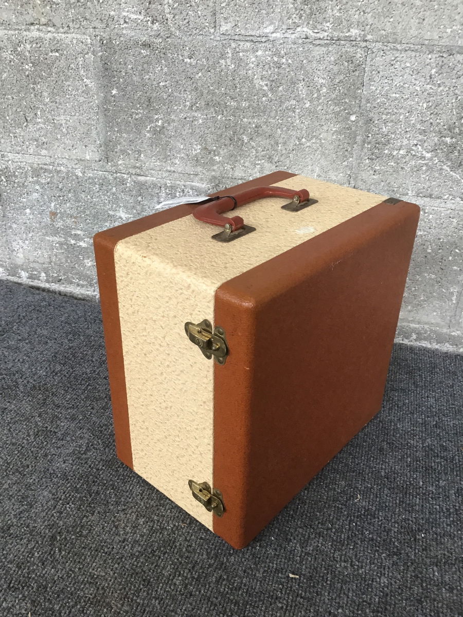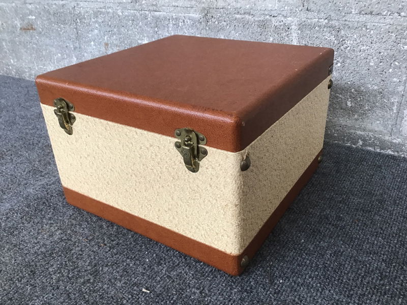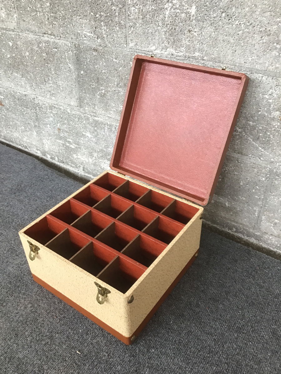 This is an older box that has a grid of organizing slots, but for what I am not sure. I was thinking sewing and someone else had maybe thought old phonograph cylinders. In any case, this is a great little case that latches shut and has a vintage plastic handle.