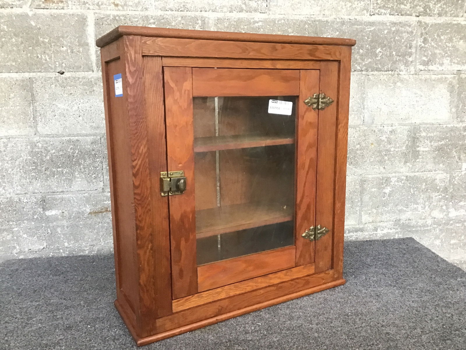 A vintage display cabinet with a Fir wood construction. This cabinet features a door with glass, three teirs of shelving and has a knob for securing when shut. This would make a good living room piece or as cool bedroom storage.