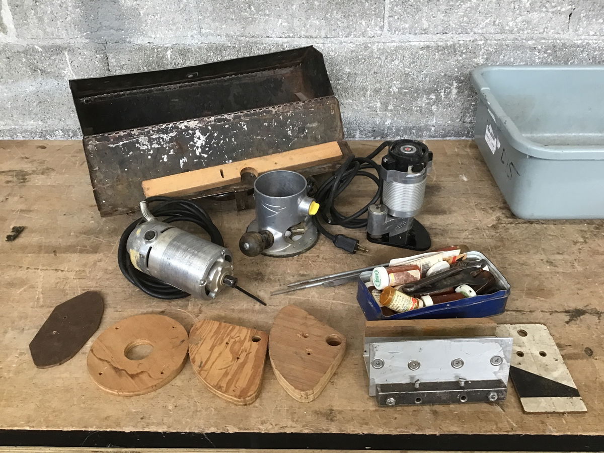 Two vintage routers with some accessories and a box. One Stanley router, one Rockwell router. Sold untested.