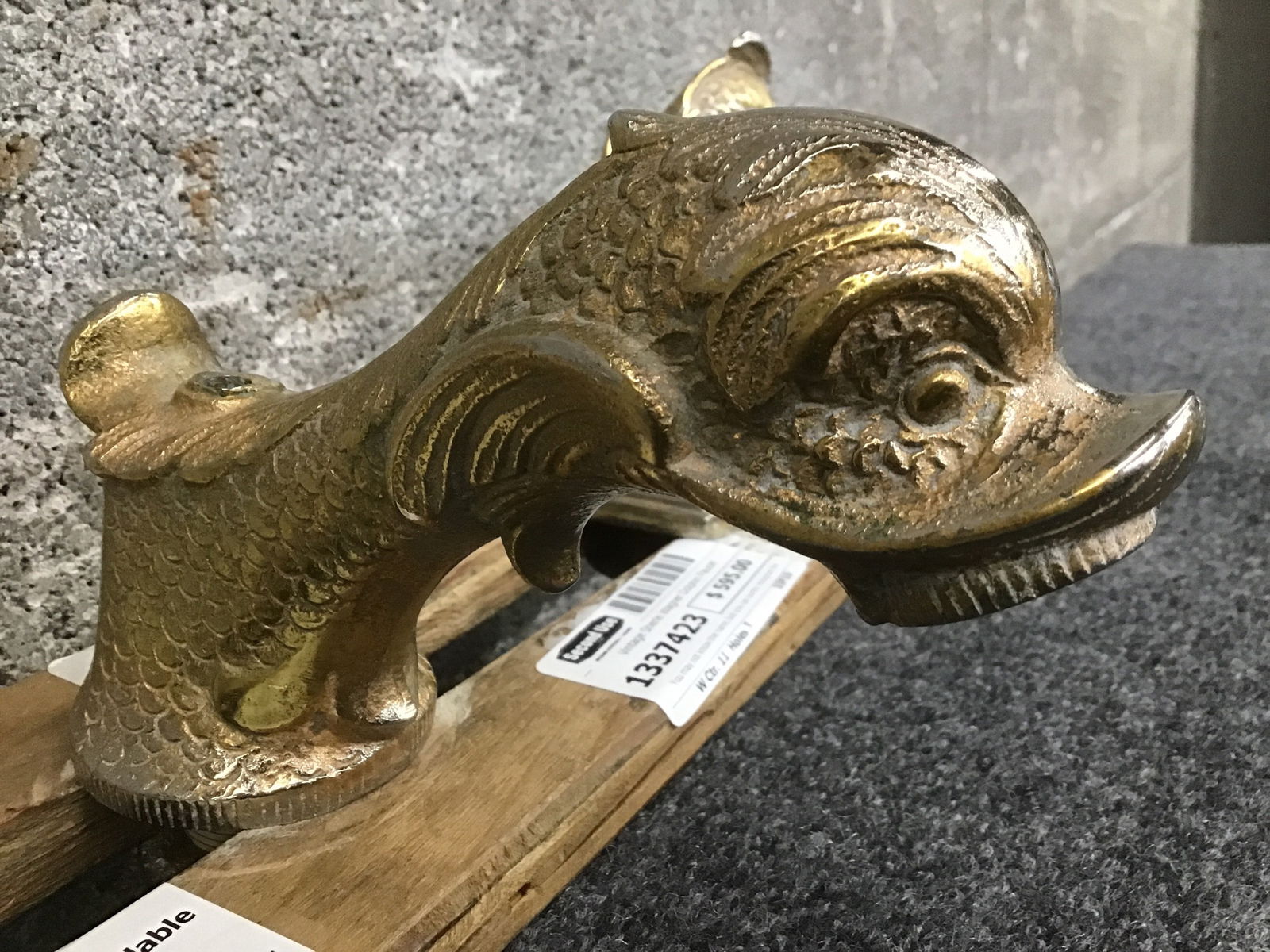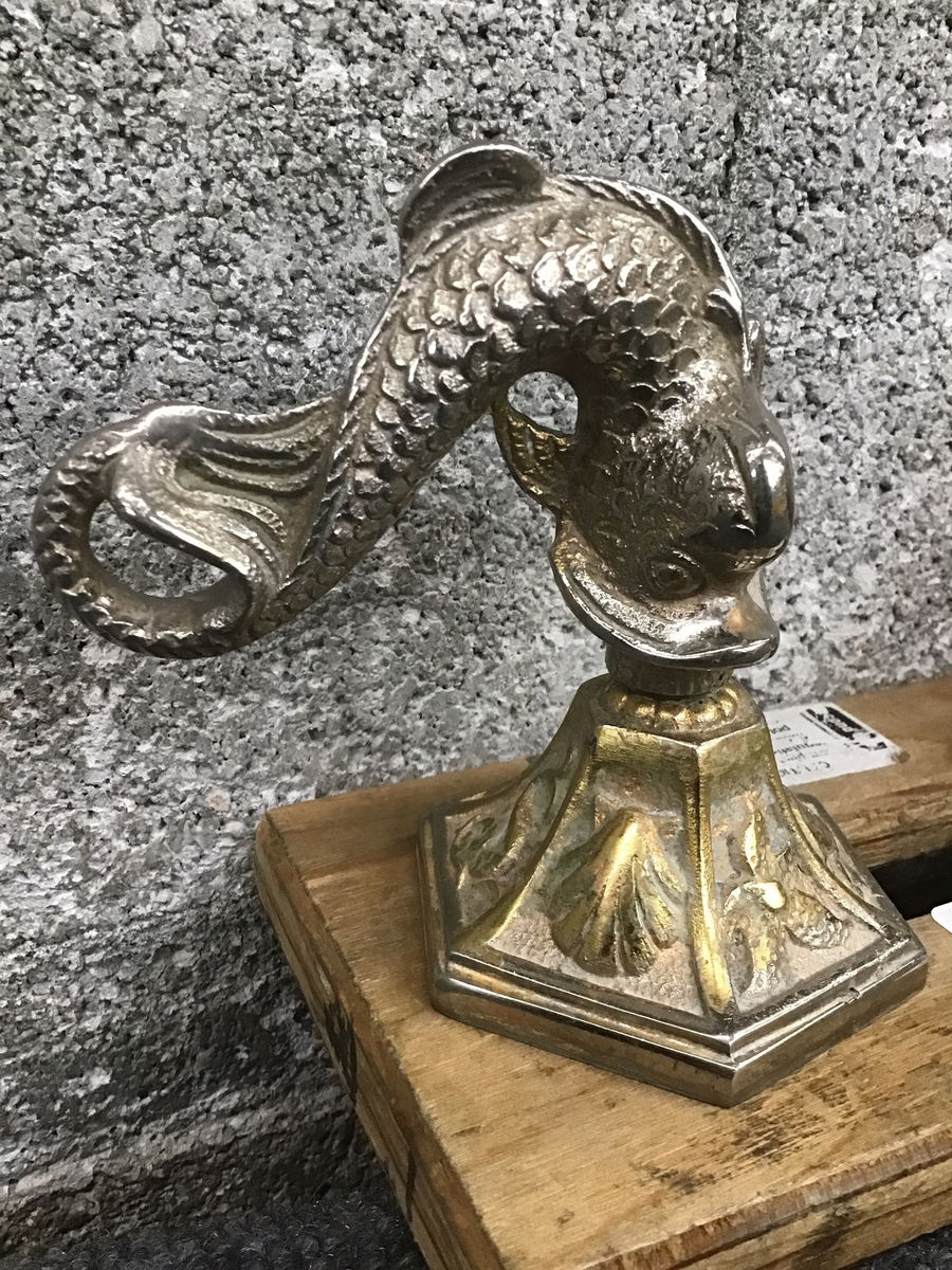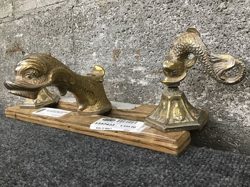 You may not know the name, but you can surely recognize the epitome of extravagance that is the original Sherle Wagner dolphin faucet! Exquisitely sculpted and cast in solid brass, then plated with 24 karat gold, this confection of a creature has likely been gleaming over its users' grubby hands since the 1950s! The dolphin - often confused for a koi fish due to the stylized scales - was the first collection offered by Sherle Wagner, and remains an icon for a reason. Though the gold plating has thinned around the touch points of this set, the impeccable craftsmanship remains evident - as if the fantastical creature is slowly metamorphosing from gold to shimmering silver. Alchemi-tastic! This set is complete with faucet, lever handles, escutcheons, and even the original pop-up handle and drain bearing the maker's mark. One doesn't often think of a bathroom fixture as an heirloom piece, but once you install this treasure in your powder room, prepare to have your heirs at each other's throats!