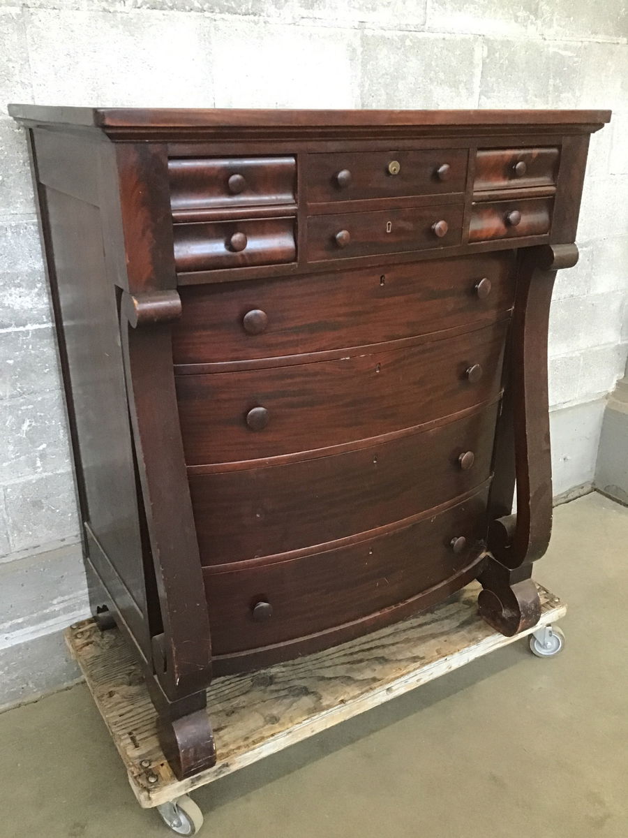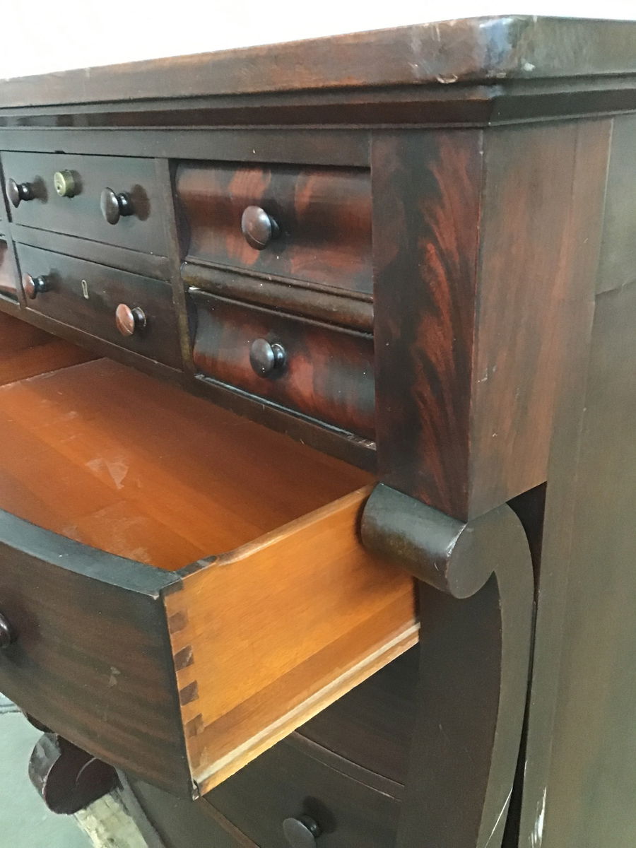 This is a stately and handsome vintage mahogany dresser from John Widdicomb. This dresser is fashioned in what is known as American Empire or just Empire style with it's simple but elegant curves. The bones are solid mahogany but the face is a beautiful figured walnut with a dark stain. Such a timeless piece!