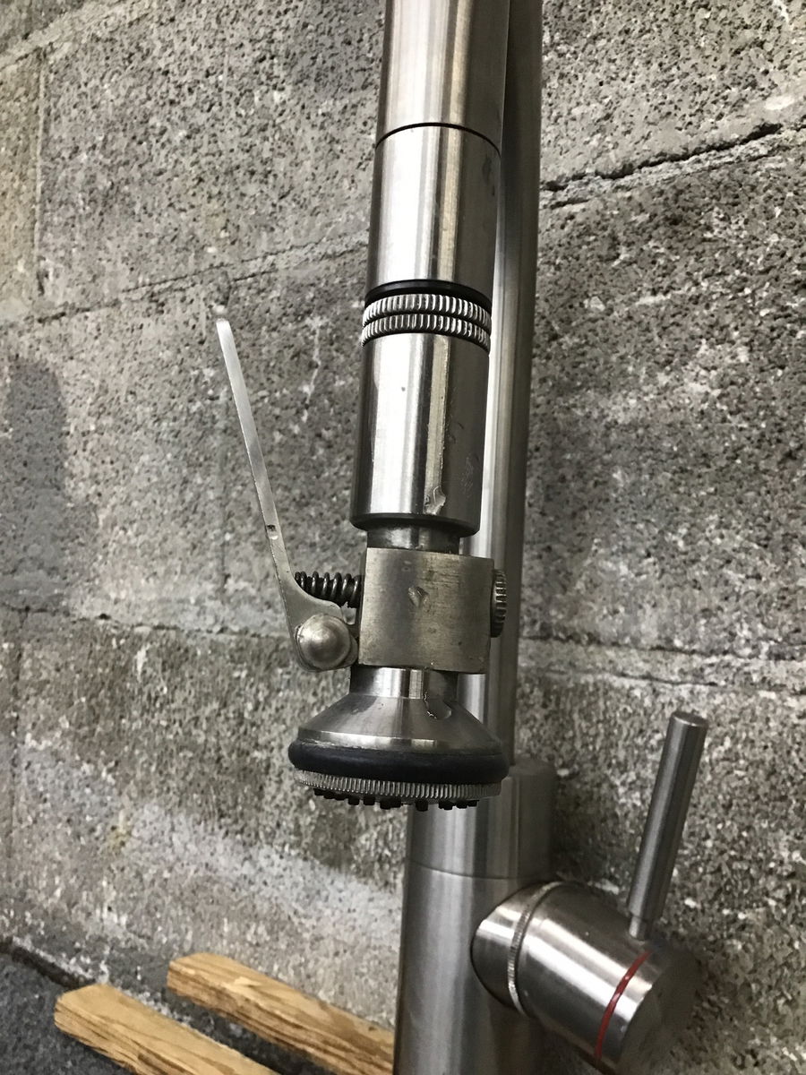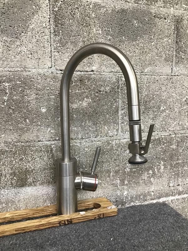 Gooseneck kitchen faucet with contemporary sprayer head by Waterstone in a Stainless Steel finish. There are a few very light scratches from general use but it has not been abused and is generally in really good condition. Full product specs are available here.