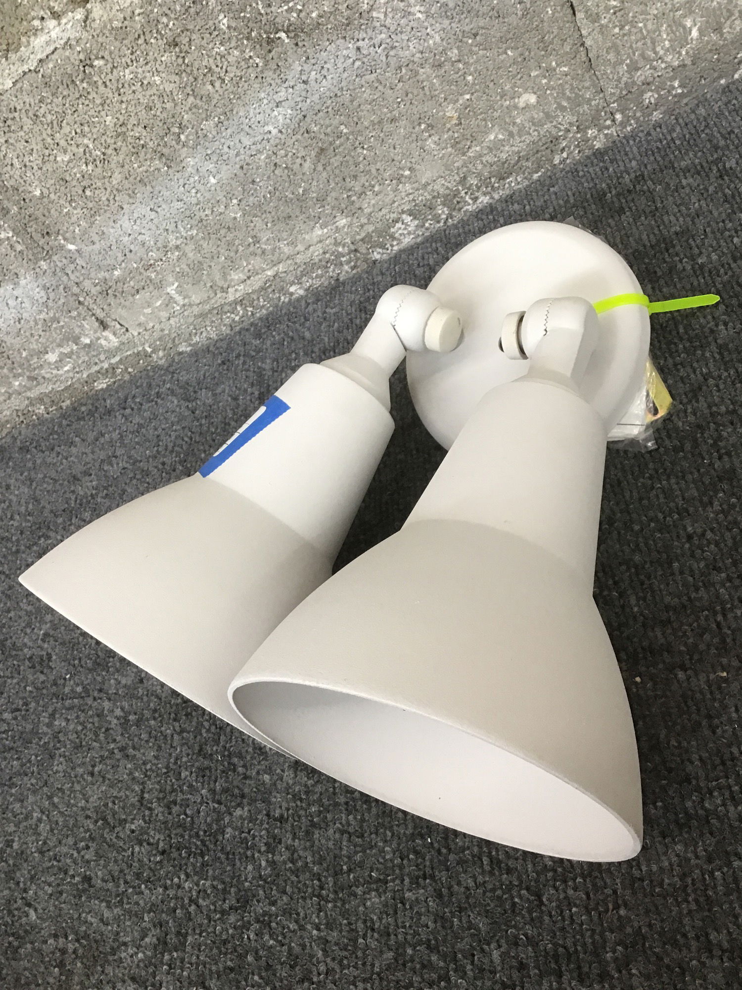An aluminum double wall sconce with a crips textured white finish. Suitable for wet locations and the lights are able to be turned in separat directions. Look to have never been installed.