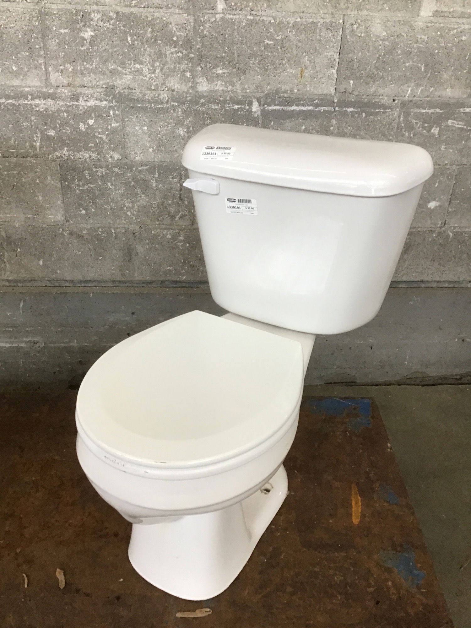 A white 1.6 gallon flush porcelain toilet that looks to be from 2011. Appears to be in decent shape.