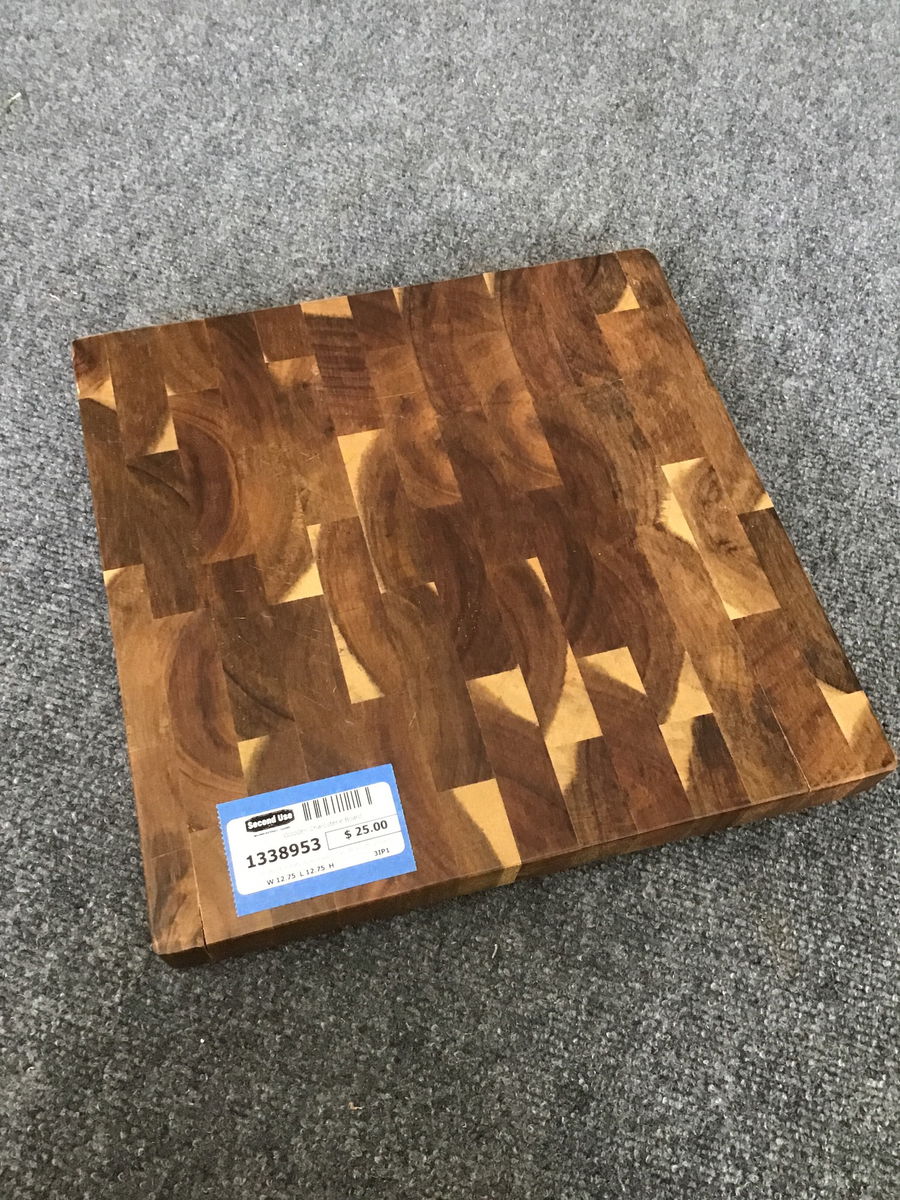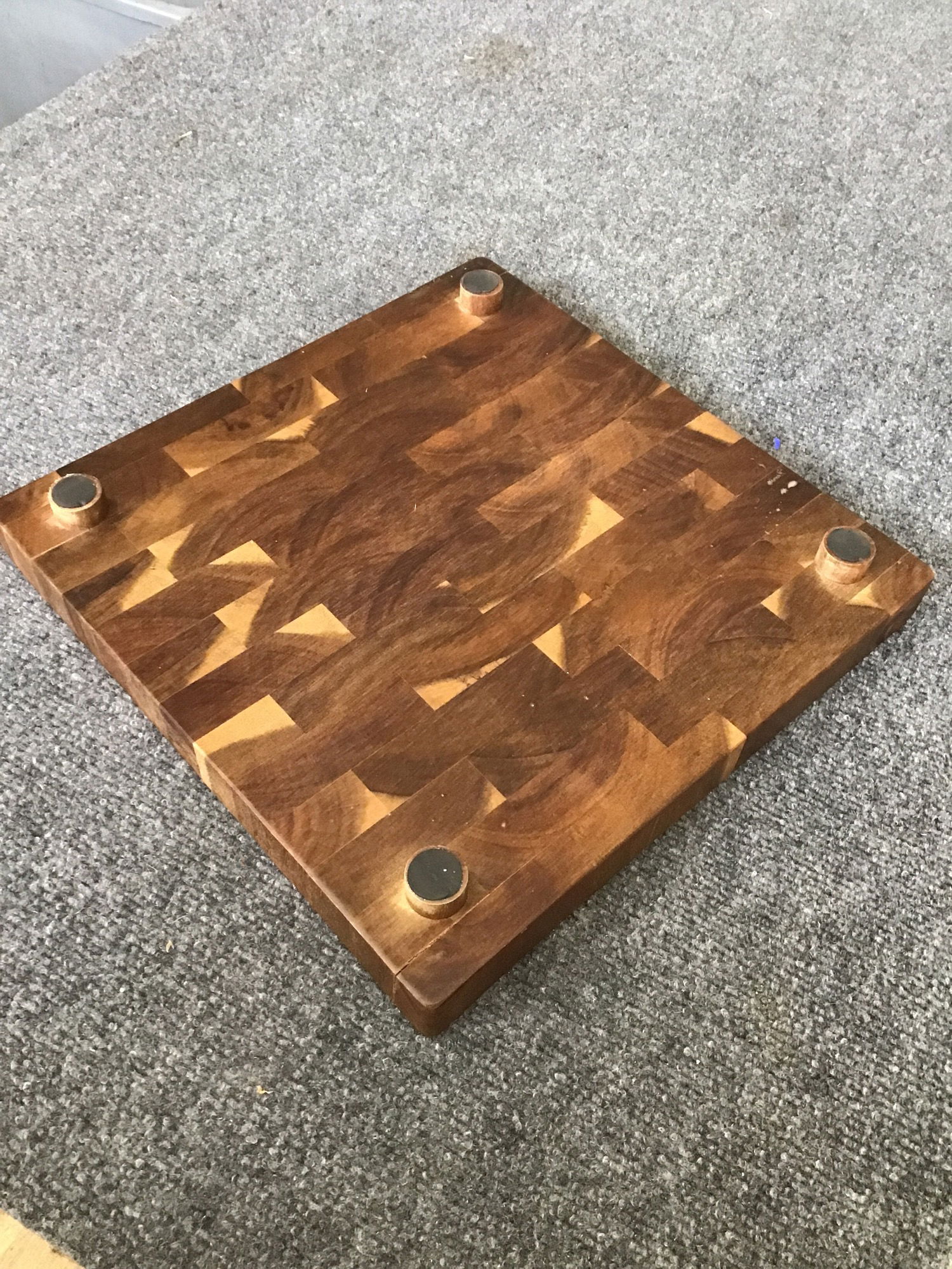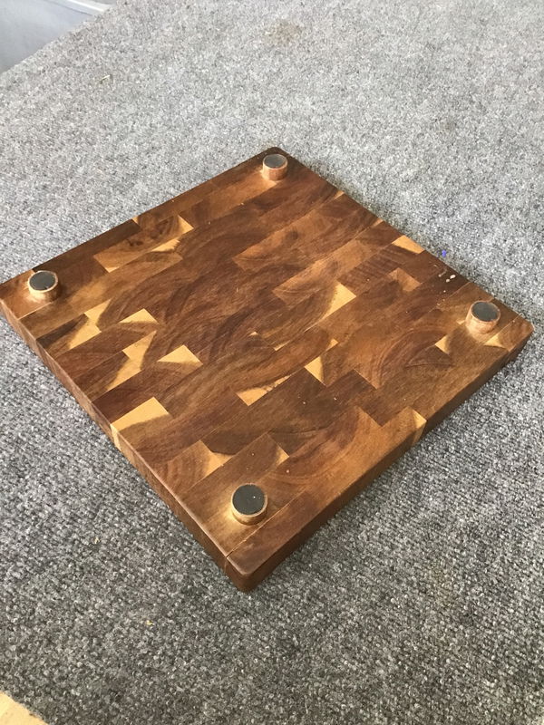 Handsome and sturdy solid wood charcuterie/cutting board on four little feet. Pretty enough to be a serving platter, practical and compact enough to be a nice cutting surface.