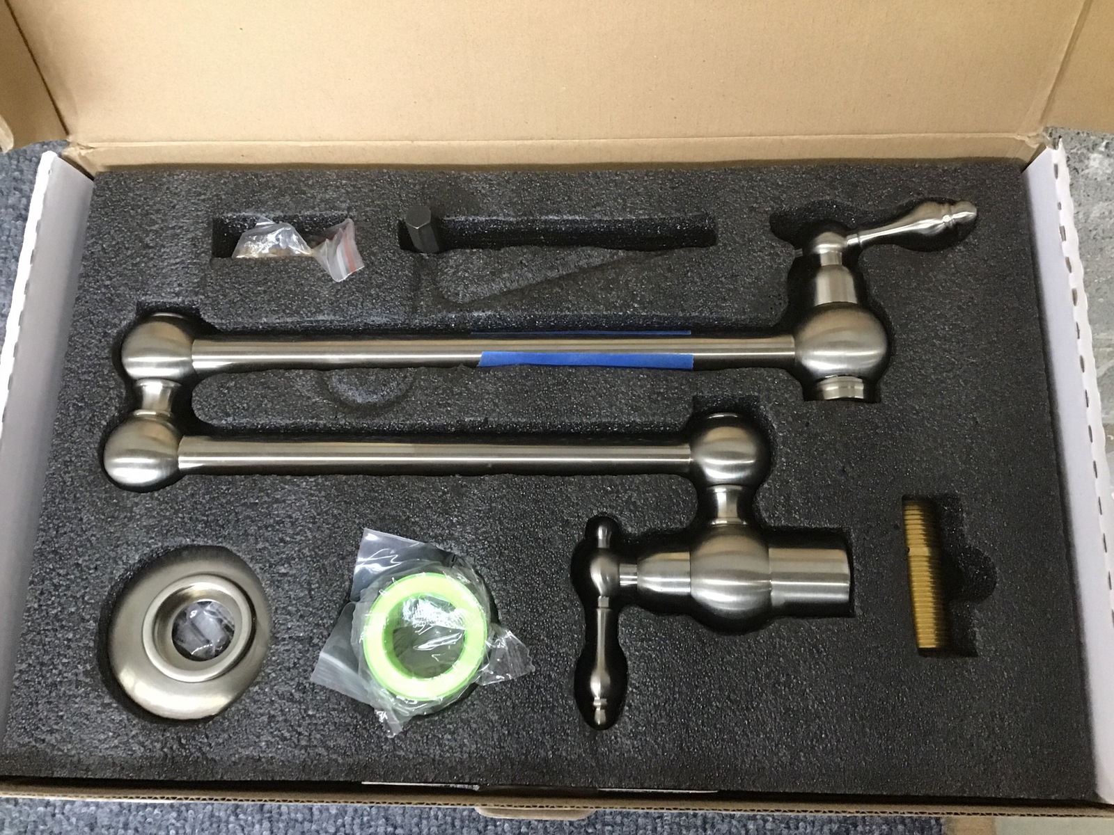 A brushed nickel pot filler wall mount faucet for your kitchen by brand WOWOW. Arrived in original packaging and looks to have never been installed before. This retails new at $95.