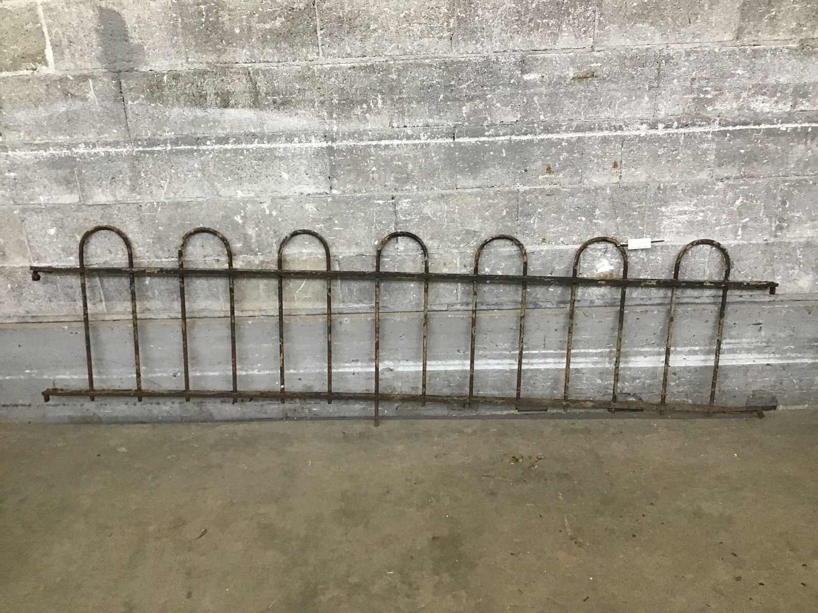A length of low wrought iron fencing that's seen some rough years- structurally, it's still good, but the finish is falling away.