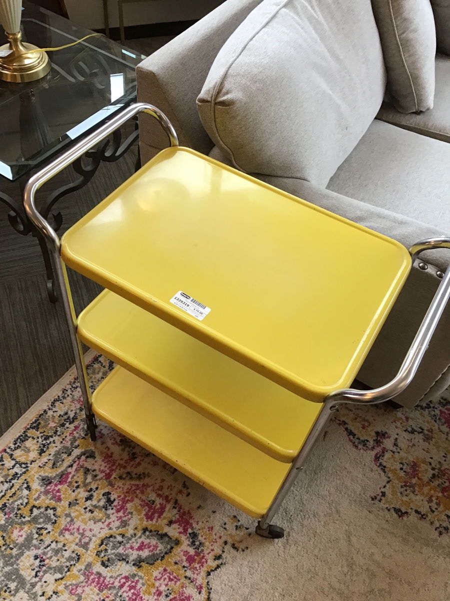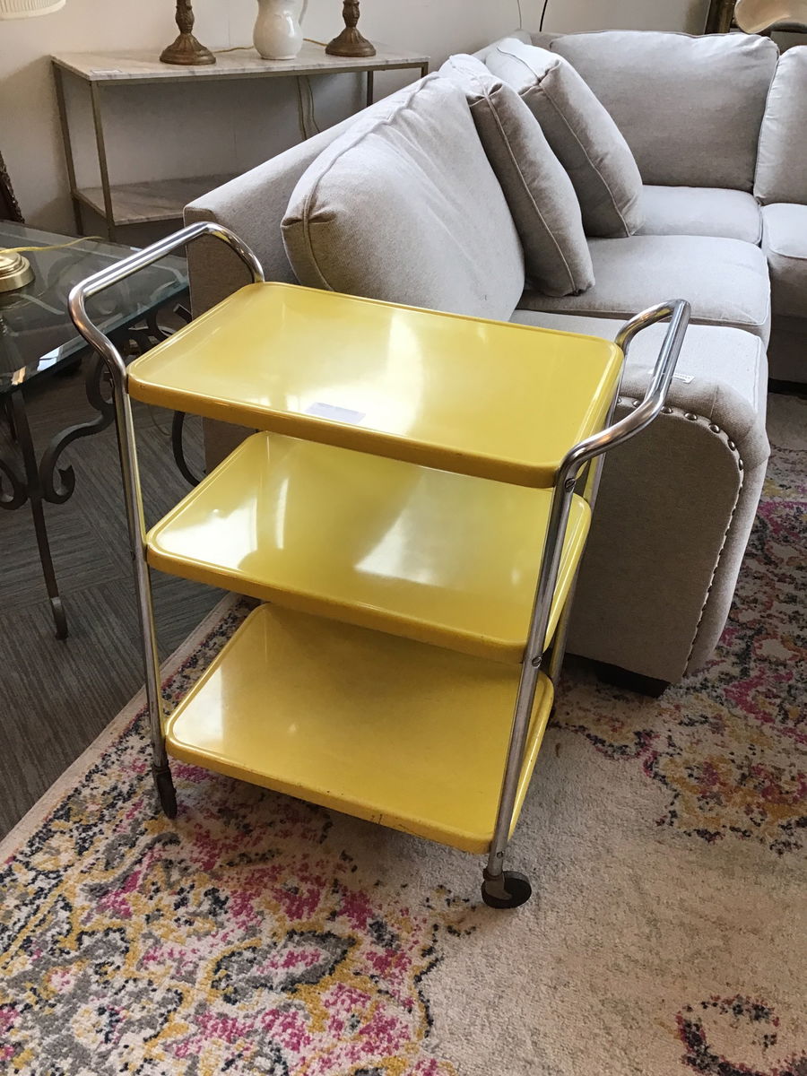 Great little three tier rolling cart in bright yellow with chrome arms. There are a few light blemishes here and there but it's in surprisingly good shape for its age, clean and ready for more work.
